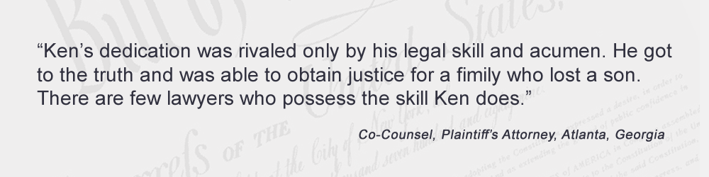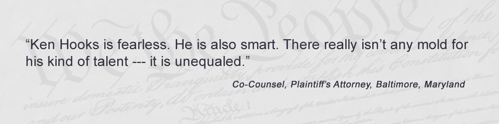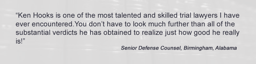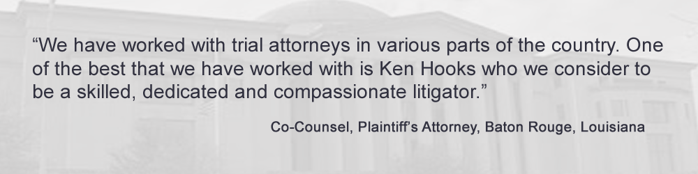 By focusing the firm's time and economic resources on a small number of very serious matters, Ken Hooks Law is better able to give each client the level of attention he or she deserves, and each case the level of preparation it requires. In significant cases, corporate defendants and their insurance companies hire only the best and brightest defense lawyers, and have seemingly unlimited financial resources to defend their positions. Consequently, if you or a loved one have been seriously injured or killed, it is absolutely imperative that you hire a lawyer who has the time, skill, stamina, and financial resources to go toe-to-toe with the biggest and toughest opponents out there, and one who has a proven track record when it comes to representing plaintiffs in big lawsuits.